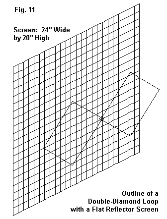 For a wider and more stable set of performance curves, the double diamond benefits from the use of a simple flat reflector. Fig. 11 shows the general scheme, using a modeled wire grid screen behind a single double-diamond array.