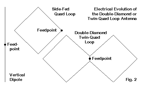The evolution that we shall track goes from the simple vertical dipole to the single side-fed diamond loop, to the full double-diamond quad, as shown in Fig. 2.