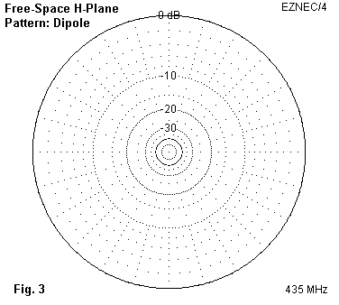 The beginning of the double-diamond quad loop abides in the simple vertical dipole. A 4-mm diameter aluminum vertical dipole for 432 MHz in free space will show a gain of about 2.1 dBi and a resonant feedpoint impedance of about 72.5 Ohms. These values are the touchstone for all further work, and the circular H-plane pattern of Fig. 3 serves only as a reminder.