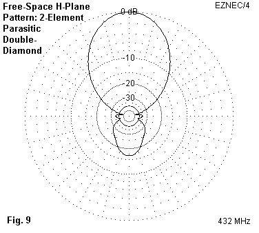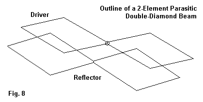From the 1/4" material, I modeled a 2-element parasitic array consisting of a driver and a reflector, as outlined in Fig. 8. Like standard quads, the reflector of a double-diamond quad must be further to the rear of a driven element than for a Yagi with linear elements. The final spacing was about 0.22 wavelength.