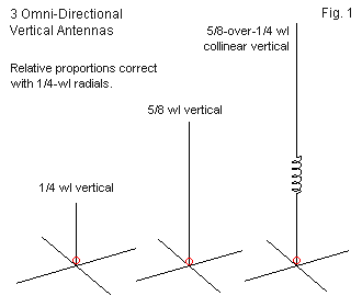 FM and repeater operations normally begin with a vertical antenna of some sort. In most cases, operators replace the rubber ducky with a vertical monopole (and sometimes a vertical dipole). Fig. 1 shows the outlines of three such antennas, ranging from the ubiquitous quarter wavelength monopole and proceeding to more complex antennas. The 5/8 wavelength monopole is about 2.5 times longer than the quarter wavelength version. The collinear on the right is only one of many similar phased vertical arrays that use a vertical element structure that does not spread in the X-Y plane.