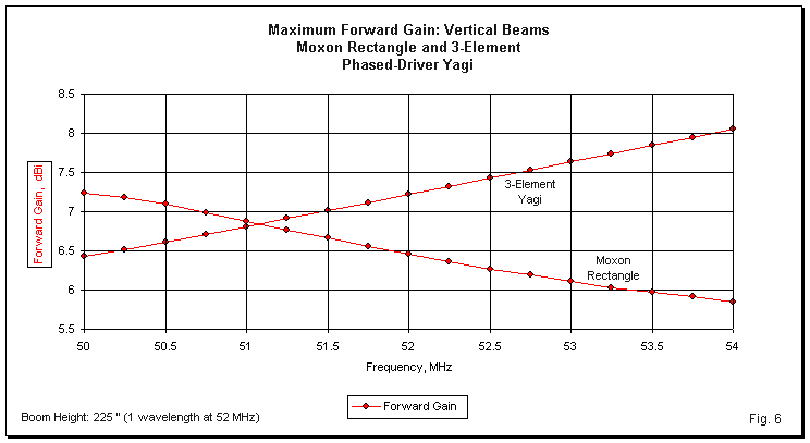 Each antenna uses a single parasitic element. The Moxon uses a reflector. Therefore, its gain decreases as the operating frequency increases. The 3-element Yagi uses a director, so its gain increases as the operating frequency increases. (Standard design Yagis using both a reflector and one or more directors show the rising gain feature, indicating that the directors tend to control the array gain more than the reflector.) Fig. 6 provides graphical verification of the gain situation for both antennas.