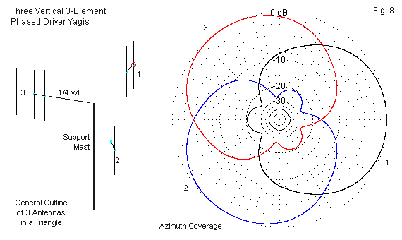The Yagi that we have selected for our design test has a beamwidth of 123 degrees when used in isolation, but at the same height as a triangle of beams. We may set up a symmetrical arrangement of 3 such antennas using the same scheme that we used with the Moxon rectangles. The booms are at 225" above ground, and the rear elements are 60" from the center point or support mast. Fig. 8 shows the general layout in the left portion of the graphic.