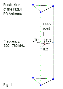 Most of these notes employ one of Dan Handelsman's designs, the P3 cut for a lower limit of about 300 MHz. Fig. 1 shows the outline of the antenna and includes dots to indicate segmentation of the wires. The P3 consists of 3 dipoles, each center fed, with triangular junctions at the outer ends. Unlike a cage dipole, where we draw the cage to a center feedpoint, the P3 uses continuous elements. From the center of each element to a central feedpoint, we employ short transmission lines, all the same length and impedance. Thus, we end up with three dipoles fed in phase with relatively close spacing and connected outer ends.