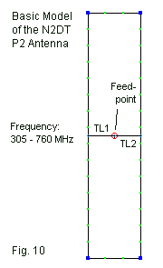 For the purposes of comparison, I created only a single planar reflector using the small dimensions that produced the most extended operation of the P3 driver. The reflector is 0.5 m horizontally by 0.6 m vertically. The P2 is 0.2 m ahead of the reflector, the same spacing used for the P3. However, the P2 driver proved to be not as well behaved as the P3. It required a change in both the Zo and the length of the phase lines: 250 Ohms and 0.07 m. Fig. 13 outlines the full array model.