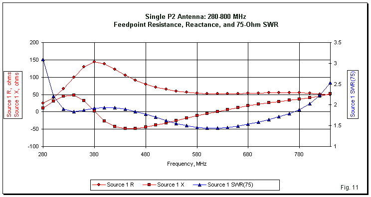 As Fig. 11 reveals, the SWR behavior referenced to 75 Ohms is not quite as neat as for the P3. Nor is the 2:1 SWR bandwidth as great. The range for the P2 is 305 to 760 Ohms, very slightly less than for the P3. Nevertheless, the shapes of the resistance and the reactance curves are very close to those that we saw with the independent P3; only the values differ.