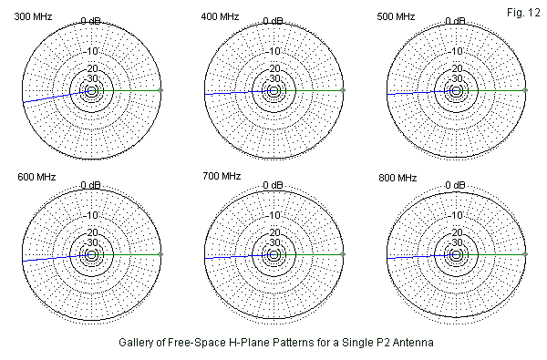 The P2 gain values require some explanation. At first sight, they appear to be universally higher than the gain values obtained for the P2. However, the P3 develops an essentially circular H-plane (azimuth) pattern. The P2 does not. Since P2 consists of two dipoles fed in phase with a small space between, the broadside gain is higher than the edgewise gain. The amount of broadside-to-edgewise difference increases with frequency, since the face distance also increases with frequency. The gallery of free-space H-plane patterns appears in Fig. 12. The gallery omits the elevation or E-plane patterns since these are so similar to the ones we saw in connection with P3 in Fig. 3. In general, averaging the maximum and the minimum gain for each patterns yields a value similar to the corresponding P3 gain value at each sampled frequency.