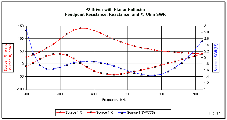 The array SWR bandwidth relative to 75 Ohms shows both an increase and a shift relative to the curve for the independent P2. The 75-Ohm SWR is 2:1 or less from about 315 to 800 MHz. The frequency ratio is a little over 2.5:1, while the bandwidth is close to 87%. Fig. 14 graphs the feedpoint resistance and reactance, as well as the 75-Ohm SWR, across the potential operating passband. Although detailed values differ from those of the independent P2, the array curves show essentially the same shape.