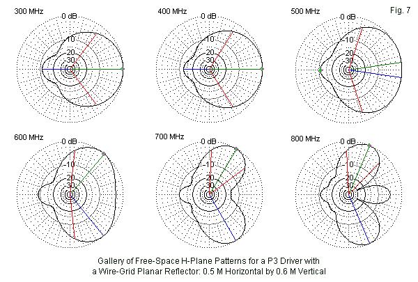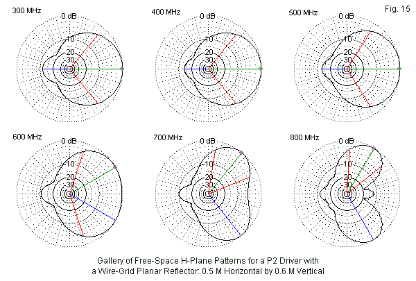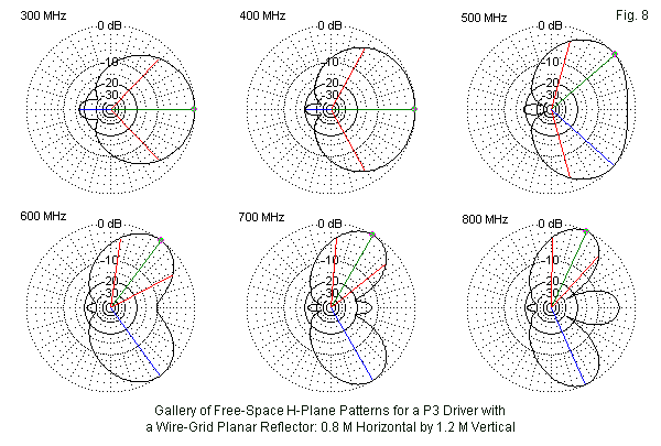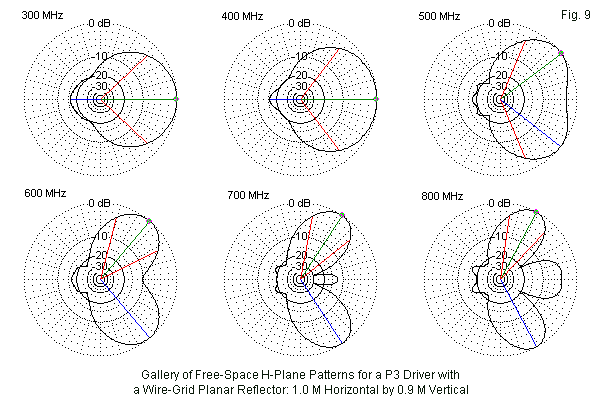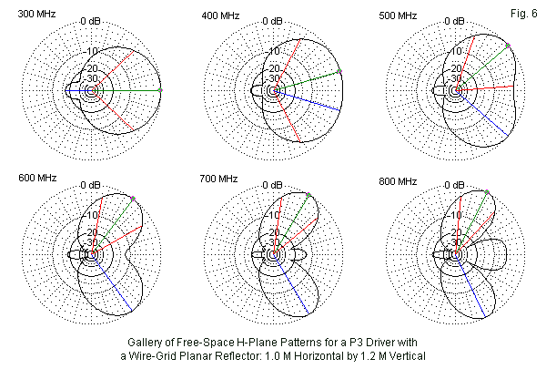 The remaining patterns in Fig. 6 provide a fairly good commentary on lobe splitting and widening and on the development of increasing numbers of forward lobes. Interestingly, the rearward lobe remains singular and quite weak. The general conclusion that one might reach is that for the P3, a large or full-size reflector limits the effective operation of the P3 to somewhere between 400 and 500 MHz, despite the fact that the SWR bandwidth is much wider.