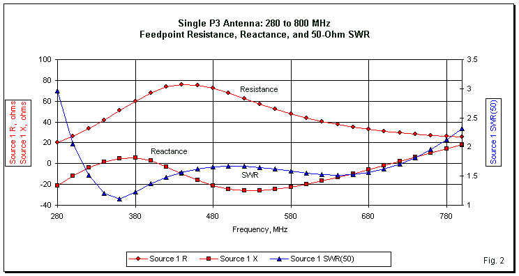 The modeled P3 showed a 50-Ohm SWR curve with approximate limits of 300 and 760 MHz, for better than a 2.5:1 frequency ratio or about an 87% bandwidth. Dan achieved slightly better results by judicious model tweaking, while some lab versions of the antenna tested by David showed a measured frequency range of more than 3:1. However, for our inquiry, the 2.5:1 range is more than satisfactory. Fig. 2 graphs the progression of feedpoint resistance and reactance, as well as the 50-Ohm SWR across the swept passband. The resistance and reactance values vary over small ranges and undulate, resulting in a wide SWR curve with two low points (similar to the SWR curves of paired driver-first-director elements in an OWA Yagi).
