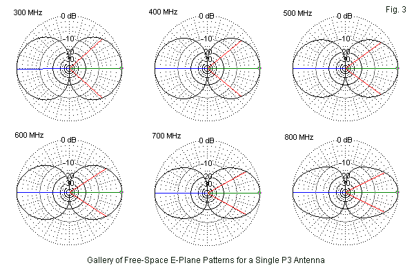 As we increase the frequency of operation without altering the physical structure of the P3, we note an increase in the free-space gain. By 800 MHz, the gain has risen almost 1.3 dB. Fig. 3 provides an indications of why this occurs. As the frequency increases, the E-plane (or elevation, given that the model stretched along the Z-axis) patterns show a decreasing beamwidth. (The H-plane or azimuth patterns would show simple circles, so I omitted them.) Between any two adjacent patterns, the change is hardly noticeable, but if we compare the 300-MHz and the 800-MHz patterns, the elevation "squeeze" in the pattern is readily evident.