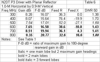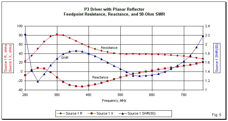 The selected spacing does not yield the best possible impedance curve. A spacing of 0.22-m is slightly better, but at a cost in other performance categories. Fig. 5 shows the resistance, reactance, and 50-Ohm SWR using the selected spacing between the driver and the reflector. The 2:1 SWR bandwidth has increased its range to 285-820 MHz. The increase is about 15 MHz on the low end, but 60 MHz at the upper end of the range--compared to the independent P3. A single graph of impedance performance is sufficient for all of the models that we shall use. Although we shall vary some of the reflector dimensions, the spacing between the driver and the reflector will not change. As a result, the feedpoint impedance values do not change by more than very small amounts that we may track in the data tables. For any given planar reflector array, the driver feedpoint impedance is relatively insensitive to changes in the size of the reflector.