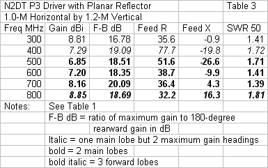 Adding the large planar reflector has increased the SWR bandwidth of the P3. However, we do not yet know if the increase is worthwhile in terms of the radiation patterns produced by the antenna. One way to present such data might be to use a frequency sweep curve. Unfortunately, such curves become very misleading if the maximum gain happens to occur at an angle other than the bore sight of the antenna. In such cases, recorded 180-degree front-to-back ratio values will reference the maximum gain heading. Hence, they will not give a true indication of the direct rearward performance of the array. For this reason, we shall explore the performance of the P3+reflector by using both tables and galleries of patterns, each at successive 100-MHz sampling steps. The front-to-back value shown in the table will be the ratio of maximum gain to a direction tangent to the rear of the planar reflector. Table 3 provides our first overdose of data.