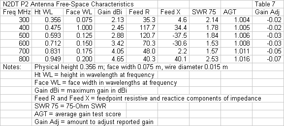 Table 7 summarizes the data for the P2, beginning with the dimensions given in wavelengths at each sampled frequency. To the right are the AGT scores and the required correction of the raw gain reports. Due to the relative simplicity of the P2 structure, these values are superior to the values we obtained for the P3.