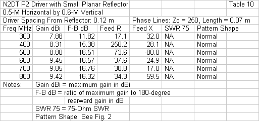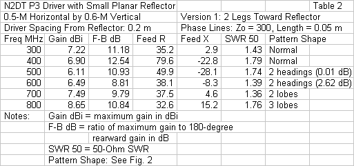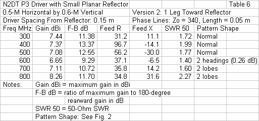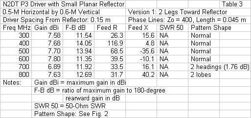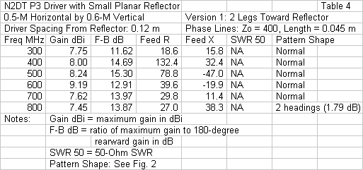 For version-1 arrays, several trends emerge from the tables. First, the maximum gain increases at virtually all frequencies with a closer spacing to the reflector. Second, the average front-to-back ratio also increases with a closer spacing between the driver and the reflector. Perhaps most notable among the consequences of closer spacing is the increasing frequency at which we obtain normal patterns. With a spacing of 0.12 m, we find normal patterns through 700 MHz, and even the 2-heading pattern may--under some circumstances--be declared usable.