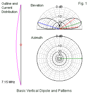 The root antenna for what follows might seem to be a vertical dipole. Table 1 and Fig. 1 summarize the properties of a vertical dipole that extends from 1' above ground level to a top height of 67.6'. The total wire length is 66.6', but this exact value applies only to a resonant vertical dipole over average soil. Slight adjustments are likely for different soil types, especially since the lower end of the antenna is so close to the ground. As will be the case for all models used in these comparisons, the performance and dimension values do not account for the influence of objects in the immediate area of the antenna installation, that is, the so-called ground clutter. All vertical antennas require as much clearance from ground clutter as the installation site will permit.