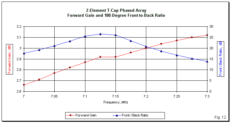 Nevertheless, the reversible 2-element vertical array with T-cap elements provides good service across the 40-meter band. As the 50-Ohm SWR curve at the bottom of Fig. 7 shows, the array will cover most of the band with less than 2:1 SWR. However, we early on noted that our bandwidth concerns covered more than just the SWR. We are also interested in how well the antenna performs in terms of gain and front-to-back ratio. Fig. 8 provides a partial answer to our questions.