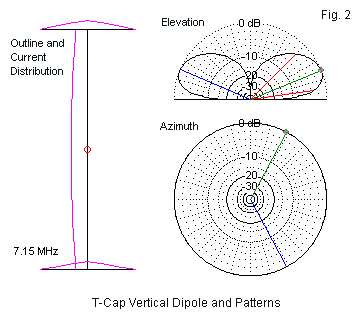 Many amateurs do not have 70' supports for a 40-meter vertical dipole in its simplest form. Individual circumstances vary, but let's suppose that the maximum support height is about 50'. Within this height restriction, we may still install a modified vertical dipole. Rather than accept the losses that center-loading or mid-element loading might create, we shall use end hats. An end hat or cap is a symmetrical structure at right angles to the main plane of the antenna. Radiation from the wires of the end cap largely self-cancels, leaving us with a vertical antenna in terms of the radiation patterns. Since the self-canceling portion of the radiation occurs in the low-current regions of the antenna, we preserve most of the performance that we might obtain from a full-length dipole. Fog. 2 shows the outlines and current distribution on one version of such a T-capped dipole/