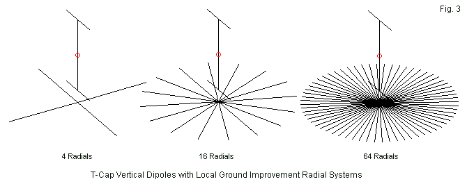 In the table, we also find some performance values related to improvements that we may make in the local ground immediately beneath the vertical dipole. When we think of local ground improvements together with virtually any vertical antenna, most amateurs immediately think of radials. However, unlike the radials of a monopole, the radials beneath a vertical dipole (either full length or shortened) perform no antenna-completing function. Rather, they simply function to raise the conductivity of the soil immediately beneath the antenna. In cases 2 through 4 in the table, I created radial systems with the hub directly below the antenna. The 1/4 wavelength radials use AWG #12 wire buried 1' deep in the average ground. As the table shows, adding 4 radials amounts to wholly wasted effort, since the gain increase is only 0.04 dB. 16 radials provide a 0.3-dB gain increase, perhaps a marginal amount, considering the work involved. If radial installation is easy, we may increase the field to 64 radials and obtain nearly 0.7 dB gain increase. Fig. 3 provides a view of the 3 radial field along with the T-cap dipole above them. You may estimate the installation work from the sketches.