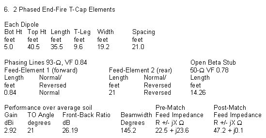 Table 6 profiles the phased array that uses two standard T-cap dipoles with 9.6' T-legs and a spacing of 21' (the same spacing used for the reversible parasitic array). Both dipoles use identical construction. The phase line uses two separate lengths that reach a junction where we shall connect the main feedline. The section to elements 1 in Fig. 11 is 084' of RG62, 93-Ohm line with a VF of 0.84. Hence, the electrical length is 1'. The line does NOT undergo a half twist or reversal. However, the line from the junction to the rear element--from the same material--does undergo a reversal. It is 21' physically or 25' electrically.