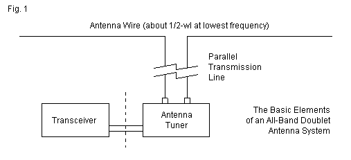 1. What is an all-band doublet? The all-band doublet is actually an antenna system and not just an antenna alone. Fig. 1 shows the basic elements of the system. The horizontal center-fed wire forms the antenna proper, which accounts for the radiation of transmitted energy and the reception of incoming energy. The parallel transmission line transfers the energy from the antenna to the antenna tuner (or antenna-tuning unit, the ATU) or vice versa. We insert the tuner because the impedance that shows up at its terminals will vary widely from one band to another. So we need a way of matching the impedance at the tuner terminals to the standard 50-Ohm input and output impedance of the transceiver.