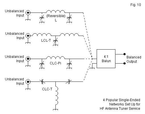 From the late 1960s onward, the single-ended network came to rule the commercial manufacture of antenna tuners. Fig. 10 shows 4 popular configurations, with the CLC-T being the most common. It was perhaps the cheapest to produce in a period of rapidly rising component costs. It would also handle a very wide range of impedances at the output terminals. However, the CLC-T was a high-pass filter network and hence provided little harmonic suppression for older rigs. Like all of the single-ended configurations, it required a balun on the output to allow for balanced lines. The standard version of the balun used a 4:1 impedance ratio either though a misunderstanding of the impedances likely to be present at the terminals or because such baluns were cheaper to make than 1:1 baluns. The baluns were transmission-line transformers that are most efficient when the reactance is very low. Most balanced lines, however, did not meet this condition. The average operator did not have multiple tuners to compare and so remained unaware that on some bands with some tuners, efficient power transfer might not occur.