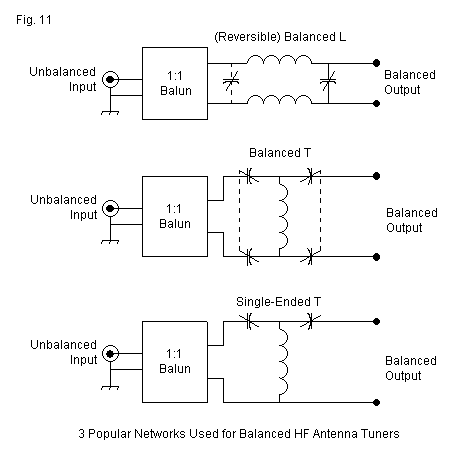 In recent years, interest in antennas that require parallel transmission lines has surged, spurring the development of new inherently balanced tuners. Fig. 11 shows three varieties that are either on the market or in handbooks. The single-ended CLC-T network is usable with special precautions not to ground any component except the transceiver side of the 1:1 input balun that is common to all of the tuner designs. One commercial tuner uses a balanced CLC-T network, but the most common balanced network tuner on the market is the reversible-L circuit. Versions exist for high power use. However, as the operating frequency increases, the range of impedances that the reversible-L will match with standard components grows more limited.