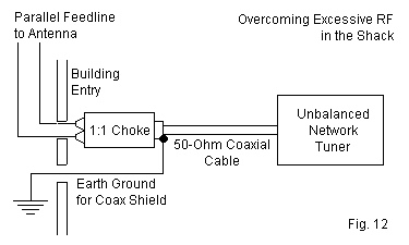 Sensitive devices, including control inputs for the rig, do not require very much energy to show signs of interference. If all else fails, you can try the system shown in Fig. 12. At the building or shack entry, install a 1:1 choke of ferrite beads, following the designs of W2DU. The choke acts as a balun, converting the balanced line to the unbalanced coax. From the coax connector shell, run a very short earth-ground line. Ideally, the choke should go outdoors, but modern building construction may require immediate indoor installation at the entry point. Between the choke and a single-ended network tuner, run less than 20' of the largest, lowest-loss coax that you can obtain.