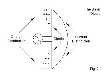 In more precise terms, the coax-fed dipole that we sometimes set up for single-band use is a more complex antenna than its appearance suggests. It is actually a center-fed resonant ½ wavelength dipole. The center-feedpoint is obvious from the position of the feedline. It is resonant since the feedpoint impedance is (almost) purely resistive, with little or no reactance. The length is electrically ½ wavelength, which for any real wire or tubular element turns out to be shorter than a physical half wavelength. Finally, it is a dipole because, as Fig. 2 shows, the charge is minimum at the center feedpoint and maximum at the element ends. As a result, the current is maximum at the center and minimum at the wire ends. The dipole undergoes only one transition in charge and in current from the center to the wire end.1