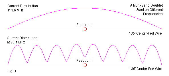 When we use the antenna on many bands, it becomes electrically longer, because the length of a wave grows shorter with rising frequency. Hence, the charge and current patterns do not satisfy the dipole conditions above the lowest band or two. Fig. 3 shows the current distribution along a 135' wire at 80 meters and at 10 meters. Since the current does not follow the dipole pattern, the charge density is also different from a dipole. In this case, there are many transitions and the current is not maximum at the center feedpoint.