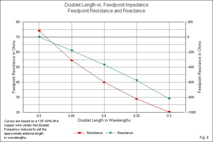 Parallel lines do have limits however. Remember that we recommended ½ wavelength at the lowest frequency as the shortest antenna wire length. We also suggested that we might press shorter wires into service, but we did not say how much shorter. Let's see what happens below 80 meters as we shorten the wire from a ½ wavelength starting point. Fig. 4 shows the approximate resistance and reactance. Although the curves appear to track each other, remember that the downward path of reactance actually represents increasing capacitive reactance. As we shorten the doublet or lower the frequency, the feedpoint resistance decreases steadily, while the capacitive reactance increases steadily. The result will be a very high 450-Ohm SWR on the parallel line. It will rise to the point where even the seemingly low-loss line shows significant power losses along the way. As a practical matter, try to keep the antenna at least 3/8 wavelength or longer at the lowest frequency used if you cannot manage ½ wavelength. Remember that you can always zigzag the wire legs or let the ends droop downward (but always with their ends out of human reach) in order to lengthen the wire to the full ½ wavelength at the lowest frequency.