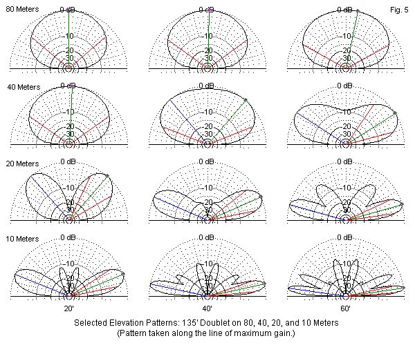 The height above ground when measured in terms of a wavelength is the most important factor that determines the elevation angle of a horizontal antenna's radiation. (Remember that the radiation angle is also the angle of reception sensitivity.) Fig. 5 provides a catalog of typical elevation patterns for the doublet. Each pattern uses the headings for maximum gain as a basis. The missing bands would show elevation angles of maximum radiation that are part way between the bands in the illustration.
