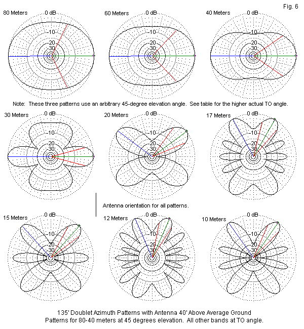 3. When the wire is close to n or to n.5 wavelengths, the strongest lobes will be those farthest from broadside to the wire, that is, closest to in line with the wire. Table 5 provides the modeled performance data of the 135' doublet at a height of 40' above ground. Fig. 6 translates those numbers into a gallery of azimuth patterns. The virtual antenna runs up and down on the graph page. Because the take-off (TO) angle (or the elevation angle of maximum radiation) is so high for 80 through 40 meters, the azimuth patterns use an arbitrary elevation angle of 45°. All other patterns use the actual TO angle.