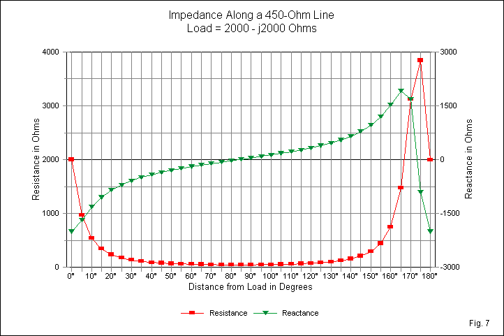 Fig. 7 shows one example of the transformation and applies to 450-Ohm transmission line and a feedpoint impedance of 2000 - j2000 Ohms. This impedance is similar to some values in Table 2. If the reactance had been inductive instead of capacitive, we would see similar curves, but the peaks would appear at 10-15° position along the line (where 0° is the antenna feedpoint and 180° is a half wavelength down the line). Note the very low resistance and the relatively low reactance that appear over much of the line's length. For this reason, placing a 4:1 balun in the line may be a poor choice for converting the balanced line to a single-ended or unbalanced line. The transformer may end up converting a low impedance to a very low impedance, regardless of the balun's ability to handle the reactance at its terminals.