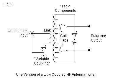 9. What kind of antenna tuner is best for an all-band doublet? The best type of antenna tuner is one with a configuration that naturally has an unbalanced or single-ended input--to accept the transceiver's coaxial cable--and a balanced output. From the earliest days of amateur radio, a common tuner meeting these conditions has been the link-coupled tuner. Fig. 9 provides a simplified schematic diagram of one version of this tuner. It received its name because the input side used a small coil or link that is inductively coupled to the tank or parallel tuned circuit on the output side. The most effective forms of this tuner used additional components on the output side to compensate for the reactance at the terminals. Taps at every turn (or at least at every other turn) of the tank coil allowed the user to find a setting that came closest to providing a good match and maximum power transfer at the same time. The link might also have switched taps with the later addition of the so-called variable coupling series capacitor. In fact, the series capacitor compensates for remnant reactance on the input side, allowing a purely resistive input impedance. Johnson Matchboxes, with simplified tank tapping, a fixed link, and no series input-side capacitor, became famous and still appear at hamfests.