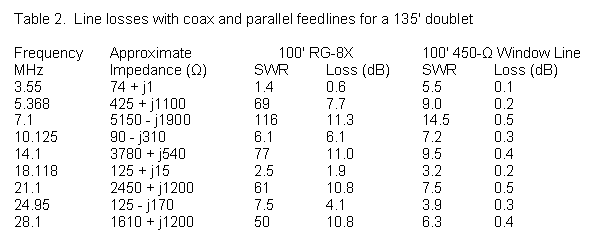 4. Why do I need parallel transmission line? Why not just coax? Or coax with a 4:1 balun? To get our hands on this question, let's consider only one of the possible doublet lengths: 135'. For this version of the doublet, we can look at the numbers in Table 2. The second column lists the approximate feedpoint impedances for each HF amateur band. These numbers will vary with the exact length of the wire and the height above ground. However, the approximations will serve well for our demonstration.