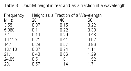 Let's continue to use the 135' doublet as our antenna and see what happens at various antenna heights that hams actually use. 20' is a typical Field Day height for wire antennas due to the difficulty of erecting and sustaining higher supports. 40' is a nice round number for a backyard doublet supported by mature trees. 60' is out of reach for amateurs unless they have a tower or two supporting rotatable beams. Now look at Table 3. It lists for each sample operating frequency the height above ground as a fraction of a wavelength.