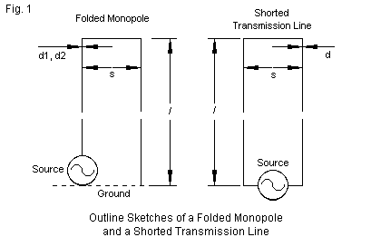 The basic principles in our initial foray into folded monopoles neglected a very important aspect of folded monopole use. Many antenna builder use lengths that are shorter than the resonant length. For very short to moderate folded monopole lengths, (where the resonant length might be considered long), the feedpoint impedance will show an inductive reactance. In that property, a short folded monopole bears a resemblance to a transmission-line shorted stub. However, the stub and the antenna have some important differences, crudely marked in Fig. 1.
