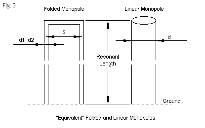 5. For every resonant folded monopole, there is a linear monopole of some diameter that will resonate at the same length. The required diameter for the linear dipole is a mutual function of both the wire diameters and the wire spacing of the folded monopole. Since the equivalent linear monopole will be very large relative to the diameters of the wires within the folded monopole, it will exhibit far lower losses with real materials than the folded monopole using the same real materials, especially at very short lengths. However, the folded monopole may offer a considerable total weight reduction relative to the linear monopole, especially at longer, more stable overall heights.