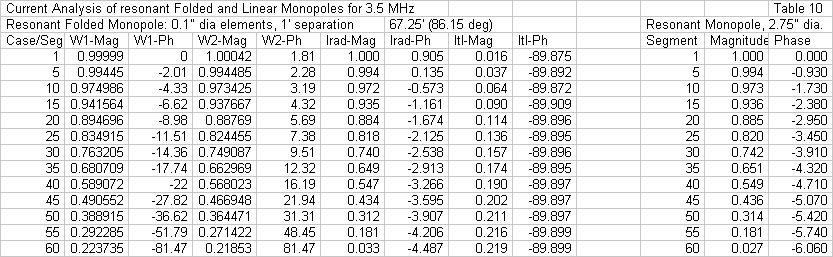 Except for the 60th segment, the radiation current magnitude values for both antennas are virtually identical. The slight aberration in the last value is a function of the folded monopole top connecting wire. Minimum current occurs at its center. As well, the pattern, although not the precise values, of radiation current phase is the same for both antennas. With respect to transmission-line currents on the folded monopole, the magnitude values increase from the ground toward the top. However, the phase angle of these currents is the same all along the antenna and 90 degrees out of phase with the feedpoint current. We would see similar results from a folded dipole counting from the feedpoint outward to the antenna end.