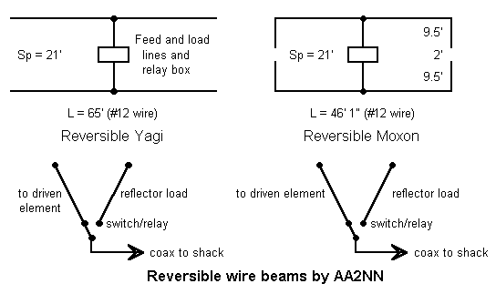 Below are outlines of the two beams. Taking the Yagi first, he uses 2 65' long #12 wires, spaced 21' apart. From each, he hangs a length of 50-ohm transmission line (9914 with a velocity factor of 0.78). The lines go to a switch, whose common terminal goes to the coax coming from the shack. Carrol switches in one direction, making the hanging line in that direction an extension of the shack coax and hence, the line to the driven element. The remaining line is not connected and becomes the load for the reflector.