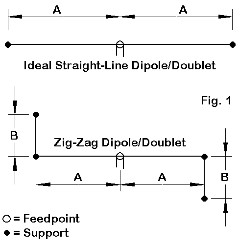 Consider the scenario sketched in Fig. 1. A standard 1/2 wl dipole for 80 meters--about 135' long when about 50' up--would look like the upper sketch if we had the room for a 67.5' long wire runs on each side of the feedpoint. However, suppose that we do not have the room for the full length of the wires. We can settle for a shorter wire antenna, but we do have another option if supports are available: the zig-zag special. What we did with dimension A in the top drawing, we shall now do with A + B in the lower drawing.