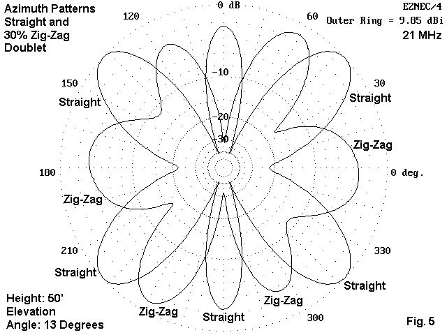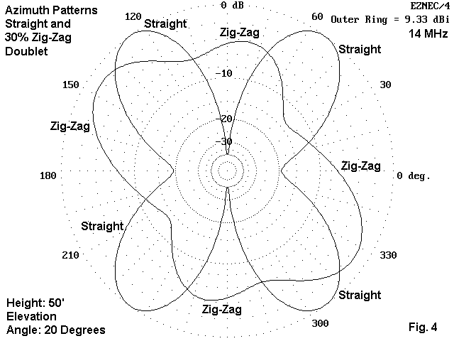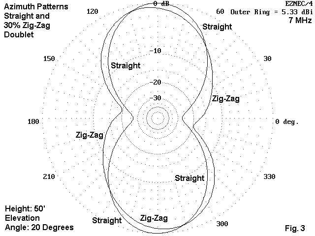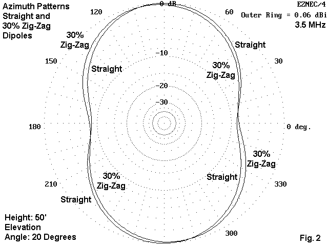 The amount of pattern tilt is very mild, even at the 30% zig-zag mark. Fig. 2 below sows an overlay of the straight wire and the zig-zag azimuth patterns for the 20-degree elevation angle. Again, in real operation, the difference will be unnoticeable. Notice that the pattern tilt is away from the bent ends.
