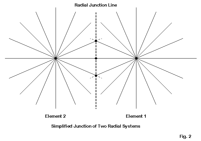 In some cases, we may have more than 2 intersecting radial systems. Fig. 3 shows three systems, more closely spaced than the pair in Fig. 2. The more closely spaced the main elements in an array, the more intersecting radials we shall encounter. Perhaps the most complex system of which I am aware is a 5 element array, with 4 radial systems forming a square around the central system.