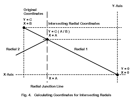 Recalculating the coordinates of radial ends so that the radial intersections are correctly placed and segmented is a straight forward process. Fig. 4 can provide some guidance. Let the "main" radial system be centered at X=0 and Y=0. If we know the radial junction line coordinate for at least one axis, we can take the ratio of that coordinate relative to the coordinate of the full length radial. Since we are working with congruent triangles for each radial, the new coordinate in the other axis will be reduced by the same ratio. As well, in a uniformly segmented radial, the ratio will also determine the new level of segmentation for the shortened radial. The new coordinate and segmentation data will equally apply to the radial that intersects the one just calculated.