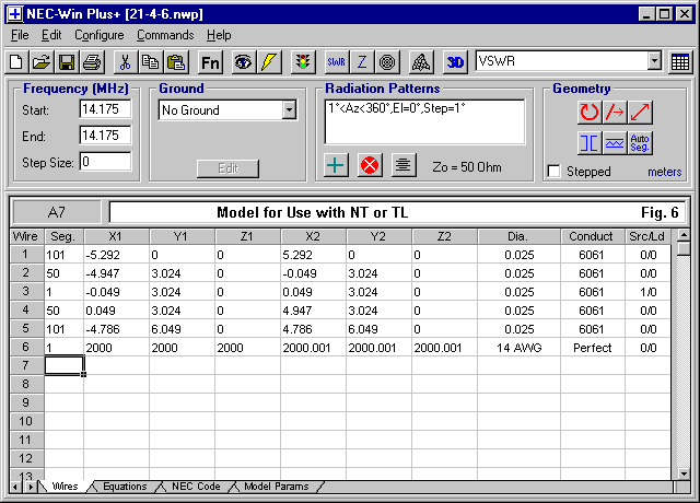 The lowest portion of Fig. 1 shows the physical arrangement. We simply add three wires to form a square with the 1-segment source wire. The high level of segmentation is designed--well within the limits of NEC's segment length to wire radius limitations--to keep the assembly as small as feasible so that it does not contribute significantly to the radiation pattern of the antenna, thereby distorting the performance reports. Fig. 3 shows the resulting model with its new square.