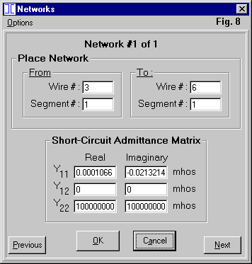 We have not yet exhausted the ways in which we can add a parallel load to a source segment. For example, we have not yet employed a "network," the NT function of NEC. We can convert the required values of series resistance and reactance to their equivalents for use in a short-circuit admittance matrix. An example of the network screen appears in Fig. 8.