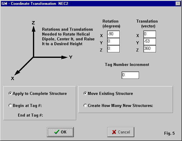 Since it is also unlikely that we would want the helical dipole to lie partially above and partially below ground when we add a ground system to the model later on, we should likely raise the antenna in the Z-axis. Perhaps 30' or 360" will do as a start. As well, many modelers prefer to have their antennas centered, with equal amounts extending + and - relative to the axis at right angles to them. This move would require that we move the structure along the Y-axis by -53 (a 53" move toward the negative portion of the Y-axis).