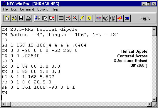 Advanced NEC-2 and NEC-4 programs sacrifice some of the convenience of the spreadsheet functions in order to provide the user with all of the core input capabilities. So we shall examine a new way to create our helical dipole using the GH input--and then combine it with the GM input that we examined in the preceding episode.