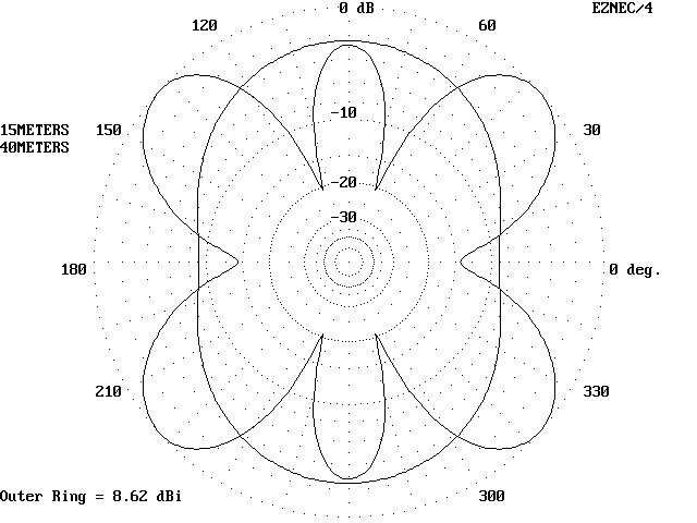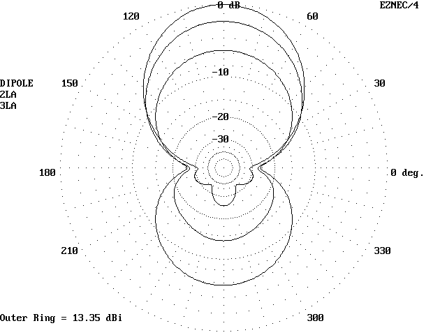 3. A 40-15 Dipole: A misconception many students pick up is that if they use a dipole, it must have something like the figure-8 pattern. A little exercise with a 40-meter dipole can correct that impression very quickly. The first step is to construct a model of a 40-meter dipole, perhaps 50' high. Make it a little long, perhaps 68.8' long with #14 copper wire. At 7.1 MHz, show the azimuth pattern at about 39 degrees take-off angle. The very oval shaped 80-meter dipole pattern for an antenna at the same height in feet is now just beginning to pinch in its sides, since the antenna is twice as high relative to a full wavelength at its frequency.